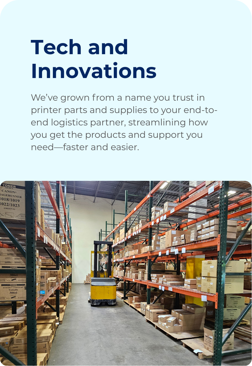 We've grown from a name you trust in printer parts and supplies to your end-to-end logistics partner, streamlining how you get the products and support you need-faster and easier.